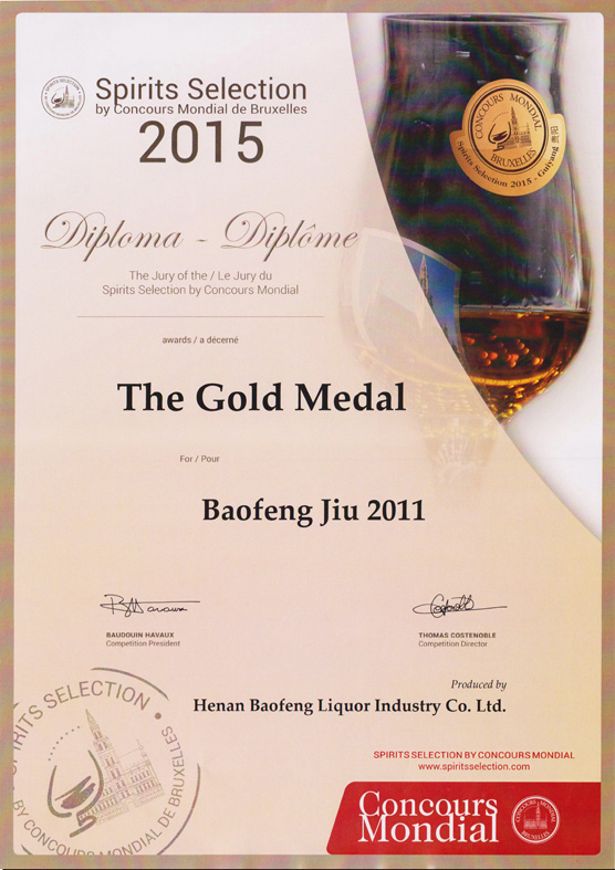 2015年9月9日,宝丰酒在中国贵州举办的2015比利时布鲁塞尔国际烈性酒大奖赛中获得金奖,从而在宝丰酒的荣誉库中又添了浓墨重彩的一笔!